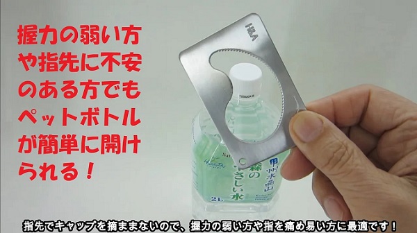 てこの応用を利用した開栓方法です。握力の弱い方にも最適、すべりやすく開けにくいアルミキャップを握らなくてもはめて回すだけでキャップを掴んで開栓します。キャップを握る必要がないので、指先を傷つけることも回避できます。当メーカーのアルミキャップも開栓動画を参照ください。